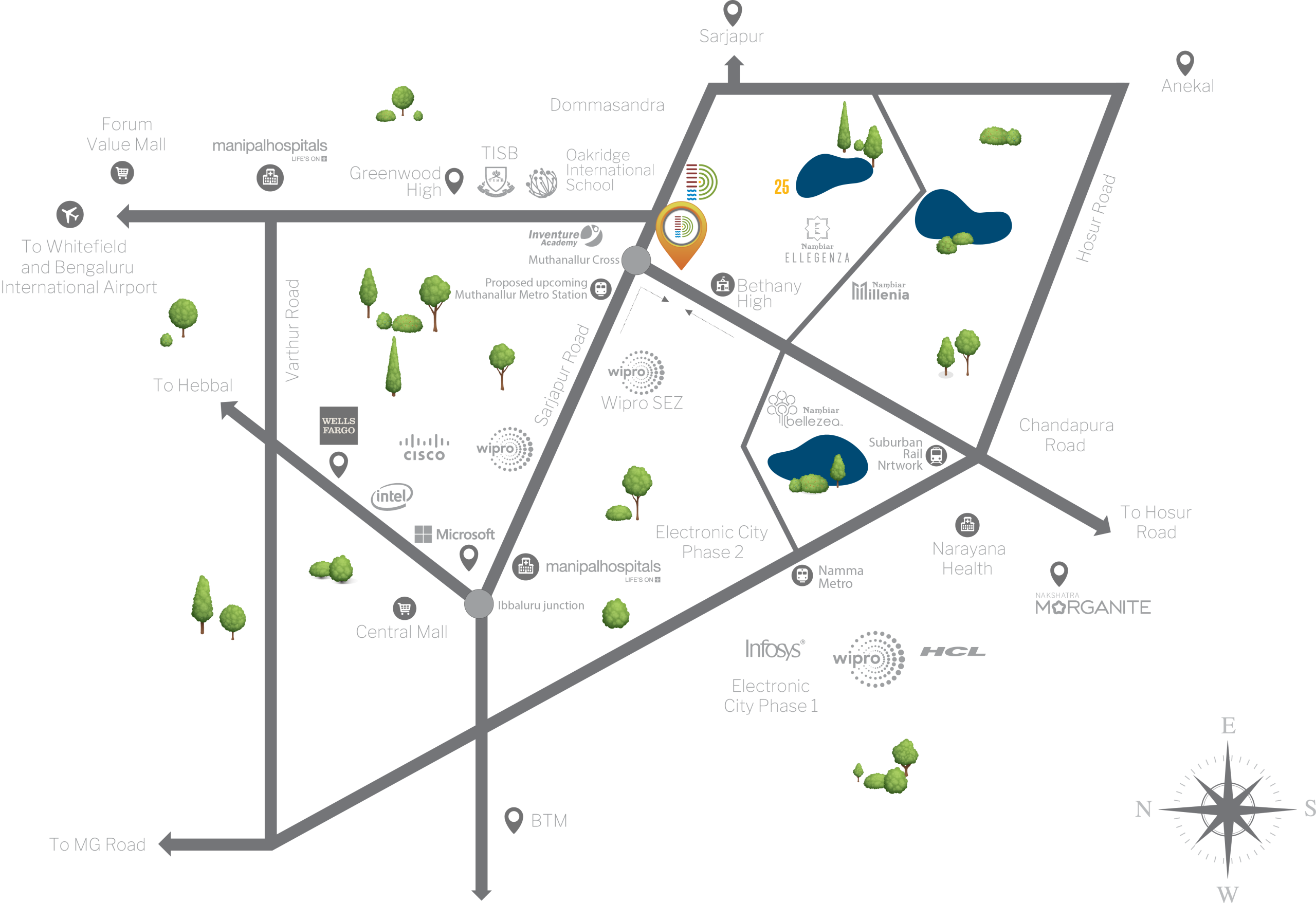 Nambiar District 25 is a unique 100-acre smart township strategically located on Sarjapur Road, near Muthanallur Cross in East Bangalore. With its offering of 796 apartments in high-rise towers, each designed for villa-style living. It also introduces a unique SOHO lifestyle in Bengaluru, a concept that ensures you're always close to the city's pulse, offering a blend of urban convenience and tranquility. This innovative lifestyle concept will surely pique your interest.